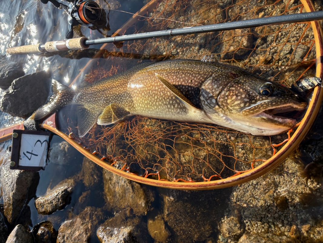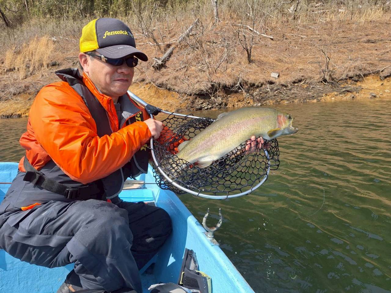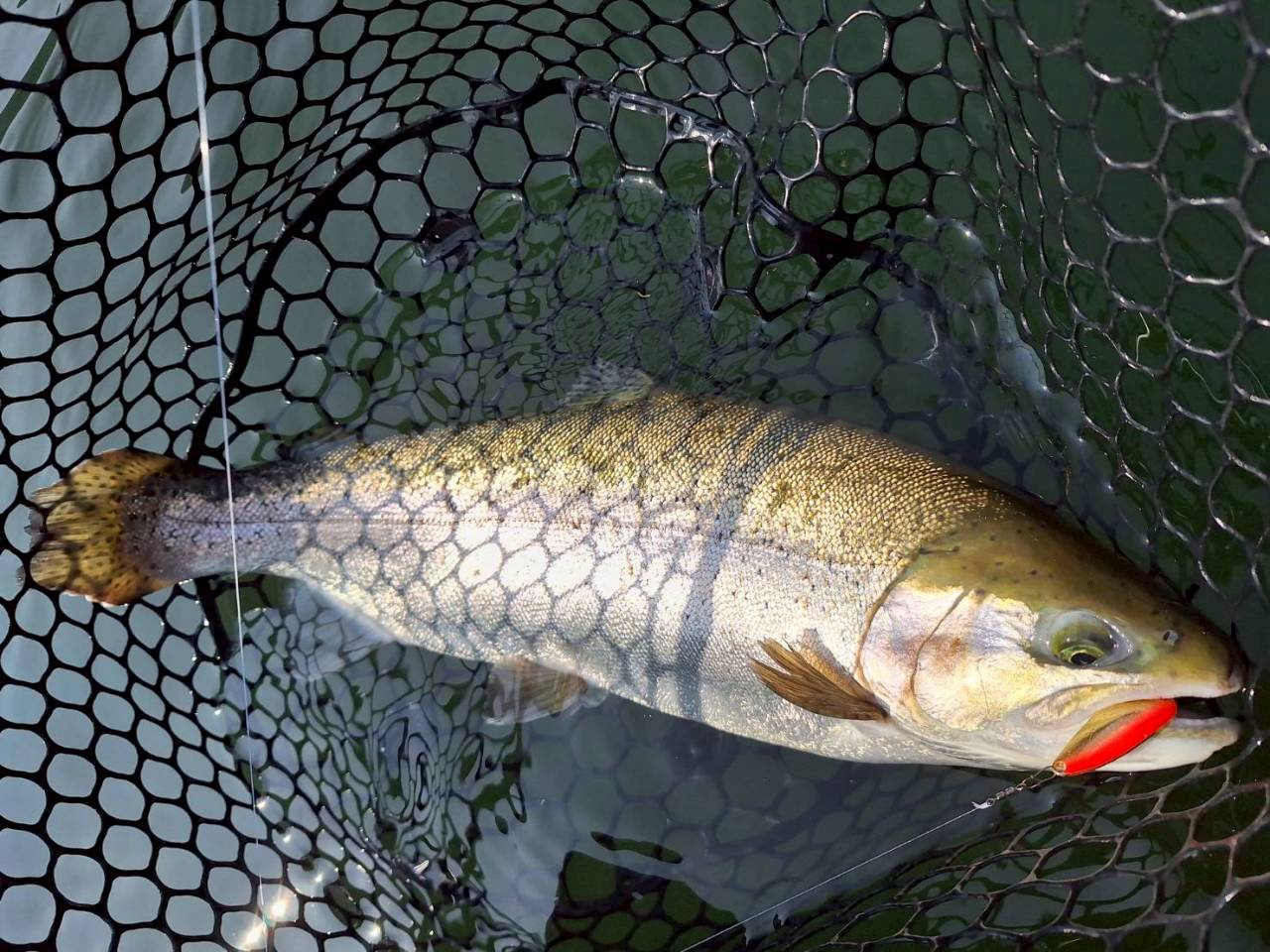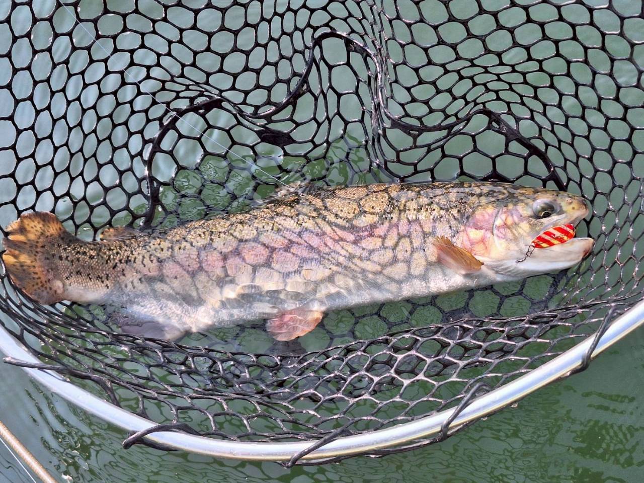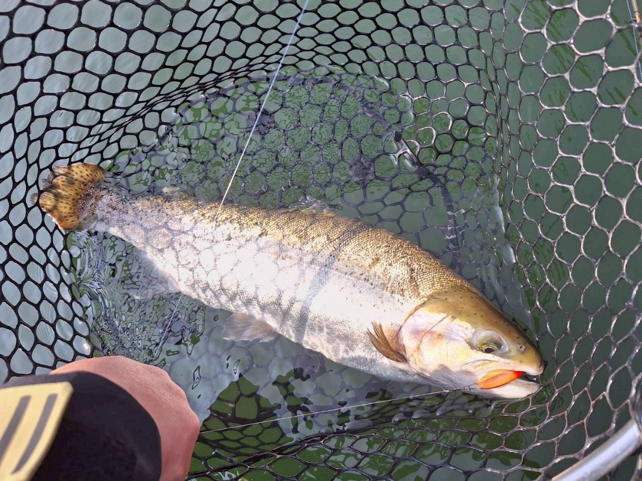 上がってきたのはレイクトラウト65cm超。解禁直後のプレッシャー下では十分な一本でした。